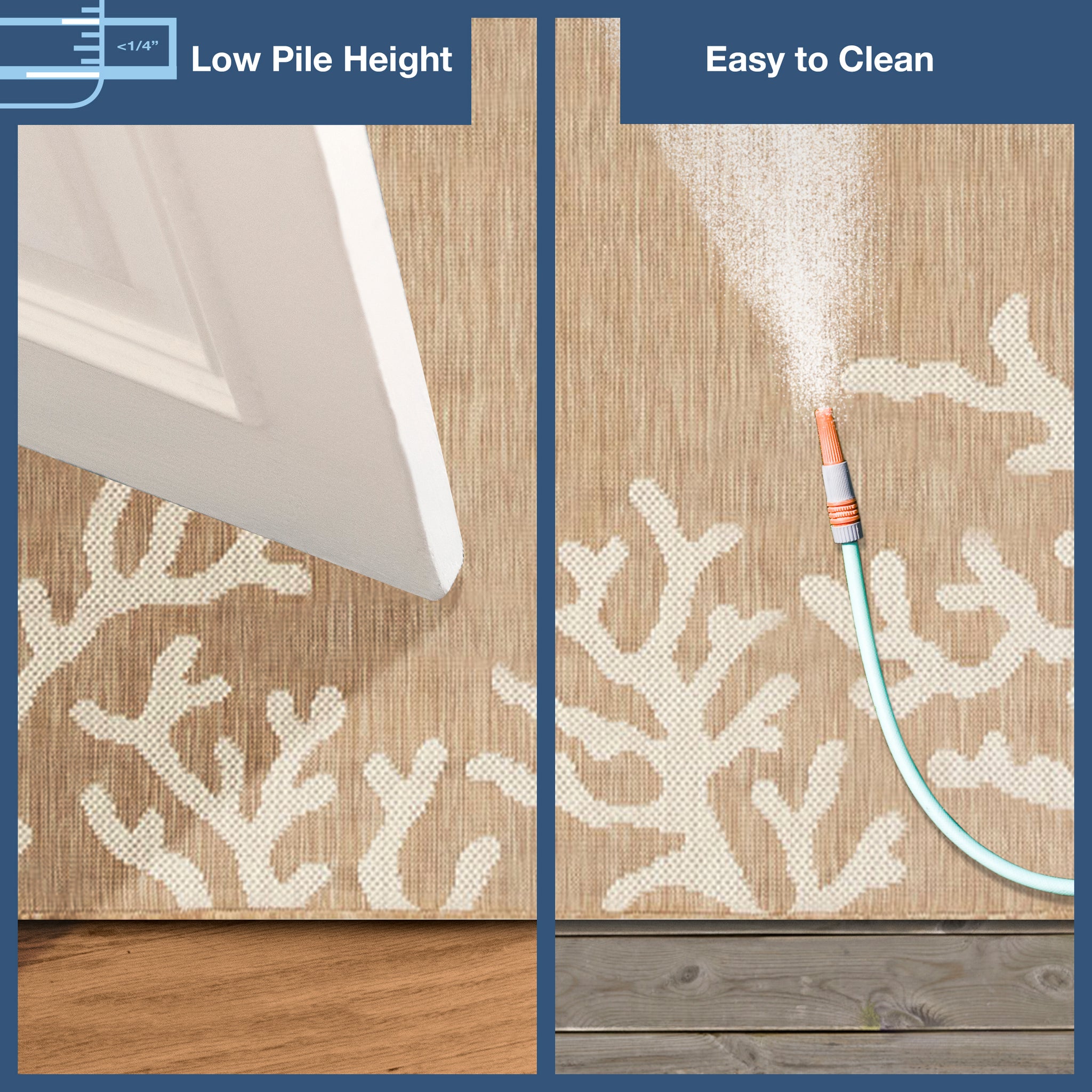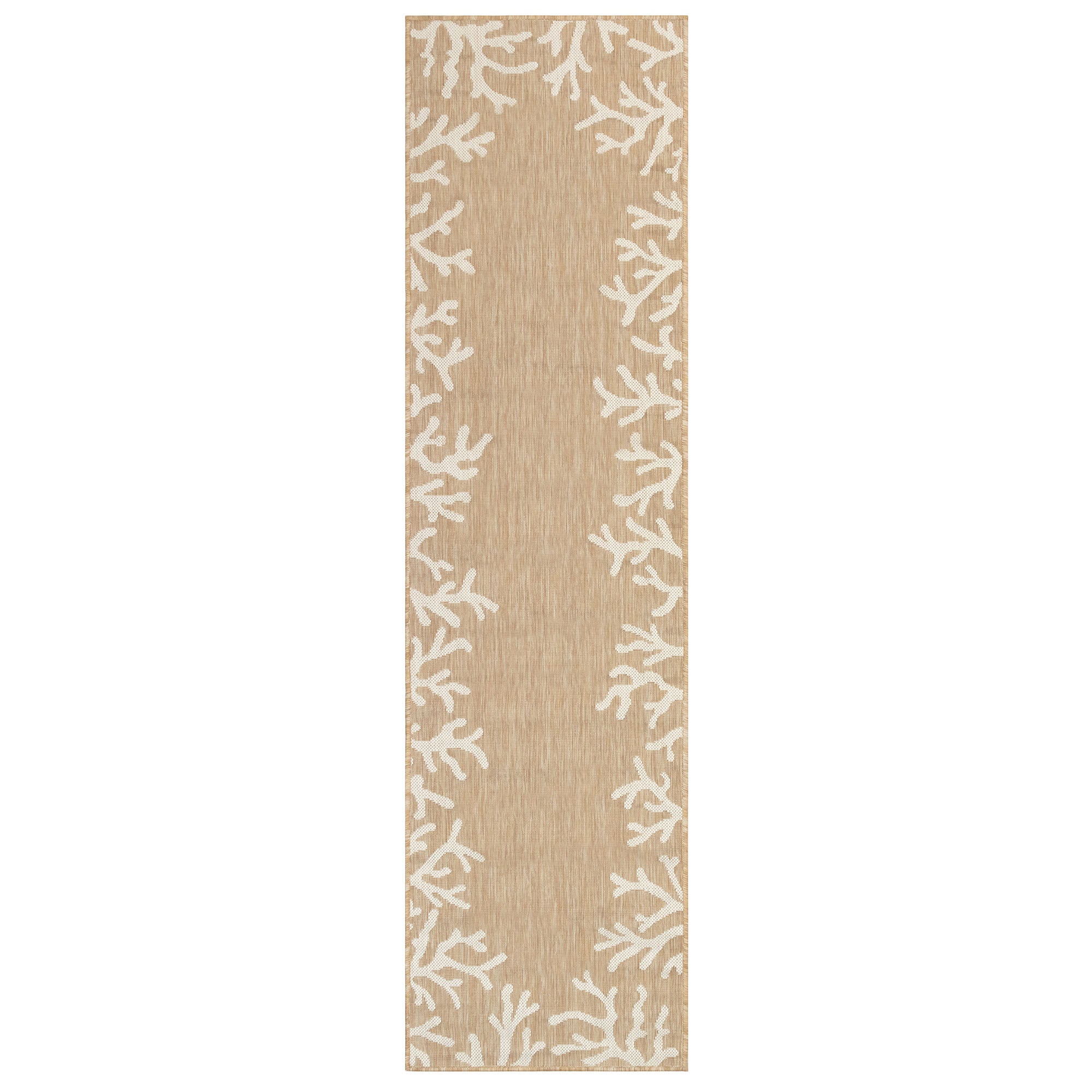 This flat area rug with a dynamic coral border brings a splash of tropical style to your home. White coral with a stylishly contrasting tan background make this a subtle but striking sea life rug, perfect for welcoming guests in your entryway, living room or as a playful detail on your outdoor patio. Made from 100% polypropylene, this collection is Power Loomed to create subtle, naturally beautiful multi-toned detailed designs with a high-quality finish. The material is flatwoven, fade resistant, durable and ideal for those high traffic areas such as your patio and living room making this the perfect indoor or outdoor rug. A fresh take on traditional area rugs, patterns range from tropical, coastal, contemporary and classic to seamlessly tie together the design of your home. Limiting exposure to rain, moisture and direct sun will prolong rug life.